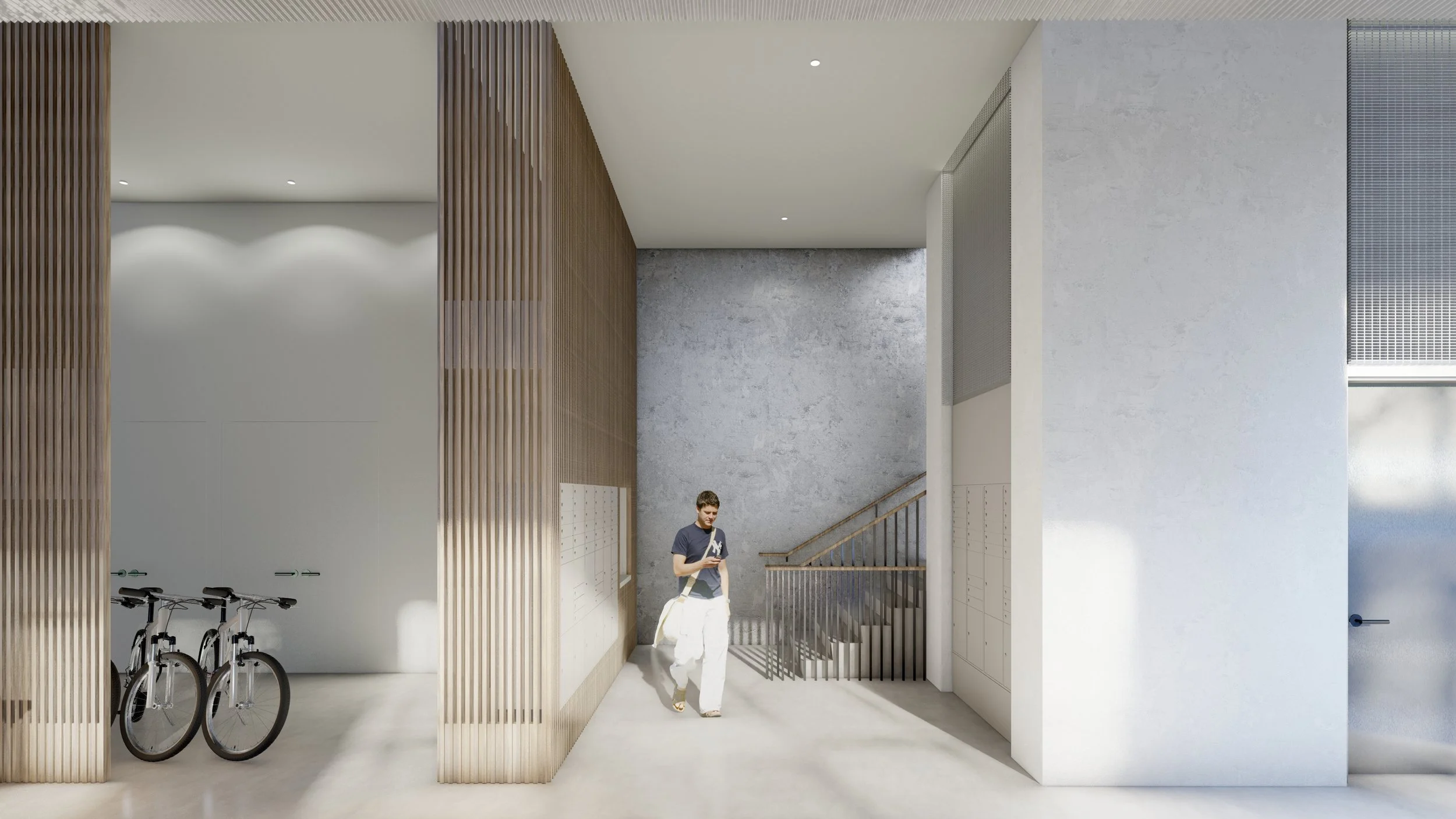 abutting the rail corridor. Meridian 105's design creates a mainstreet environment along the frontage of the building by incorporating patios and open residential spaces to create a connection to the streetscape. The building volumes are faceted to break the roofline and reduce the scale of the structure.